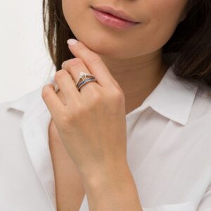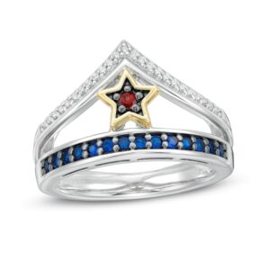 This beautiful ring for her showcases an elegant emerald-cut aquamarine at the center, surrounded by sparkling frames of round and baguette-cut white sapphires. Gorgeous pear-shaped London Blue topaz gemstones flank each side, and more round-cut white sapphires shimmer down the band to finish the look. The ring is crafted in classic sterling silver.