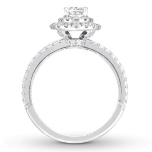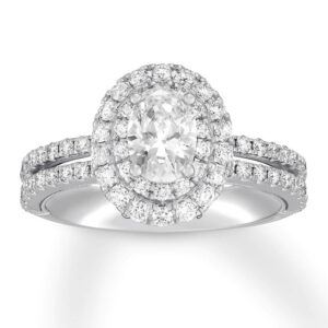 A bouquet of round diamonds forms a heart shape in this romantic ring for her. Diamonds align on either side to add a brilliance of their own, while smaller diamonds trace the heart and line the band of 14K white gold to complete the look. This enchanting ring has a total diamond weight of 3/4 carat.