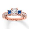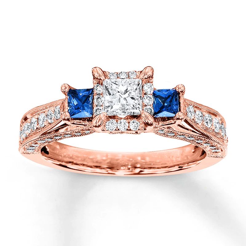 A princess-cut diamond is framed by round diamonds in the sparkling center of this gorgeous engagement ring. A square-cut natural sapphire adds color to each side of the center to complement. Round diamonds shimmer along the 14K rose gold band and profile, bringing the total diamond weight to 1 carat.