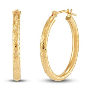 This ready-to-gift boxed set for her features three pairs of gorgeous earrings styled in iconic 10K yellow gold. The two pairs of hoop earrings, one smooth and the other embellished with intricate etching detail, secure with snap-lock backs. The stud earrings secure with friction backs.